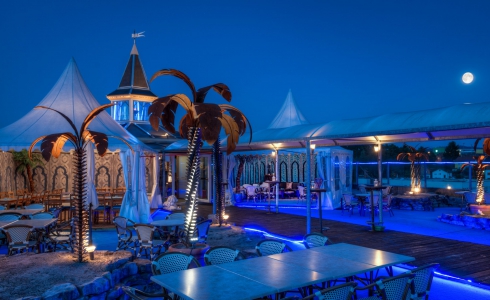 Wer hier oben die Dachterrasse betritt, entdeckt eine faszinierende, unerwartete Welt. Weiss betuchte Zelte, geschmückt